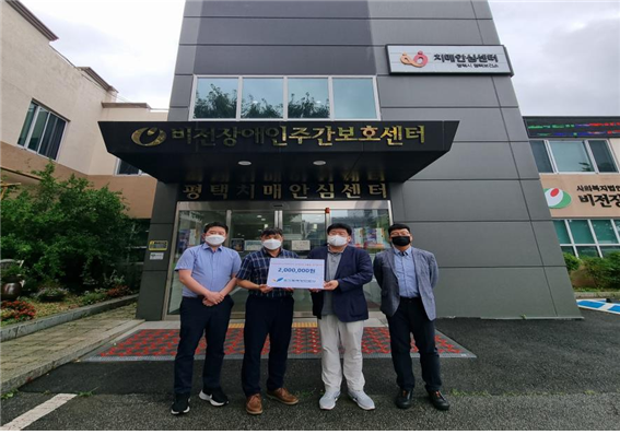 ▲경기평택항만공사가 비전장애인주간보호센터에 기부금 200만원을 전달하고 있다. 평택항만공사 제공 |