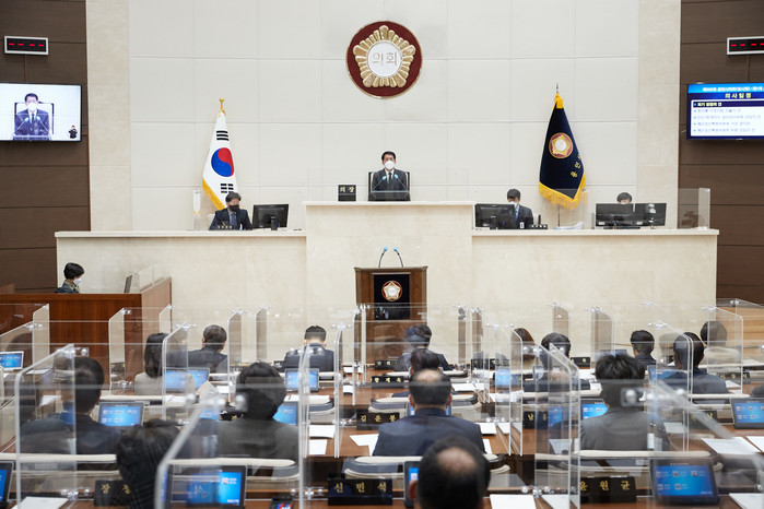 김기준 의장은 개회사를 통해 "현재 사회적 거리두기 완화 기조가 지속되면서 오미크론 확진자가 크게 늘었으나 점차 감소세로 전환되고 있고, 지금은 모두가 힘든 시간을 보내고 있지만 평범한 일상으로 돌아갈 날이 멀지 않은 것 같다"며 "의료진과 공직자, 시민 여러분의 일상회복으로 가는 길에 조금만 더 힘을 내 주시기 바란다"고 말했다.