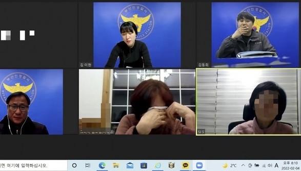 ▲부산진경찰서 형사과 실종수사팀 관계자들이 지난 4일 오후 8시쯤 56년 전 5살 때 헤어진 정숙씨(가명, 61세)의 친언니를 찾기 위해 영상회의 전용 줌(zoom)을 통해 ‘온라인 상봉회’를 진행하던 중, 어릴 적 가족관계 기억을 더듬어 혈육임을 확인한 자매가 울먹이는 장면을 형용할 수 없는 감격어린 표정으로 지켜보고 있다. 부산진경찰서 제공 |