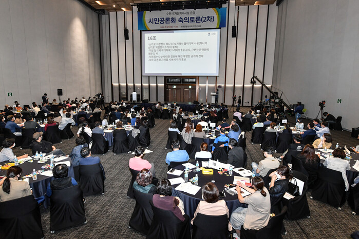 수원컨벤션센터 컨벤션 2홀에서 열린 이날 2차 숙의토론은 시민숙의단, 퍼실리테이터 등이 조를 나눠 분임토의를 하고, 결과를 공유하는 방식으로 진행됐다. 숙의토론은 수원시 공식 유튜브 채널로 생중계됐다.
