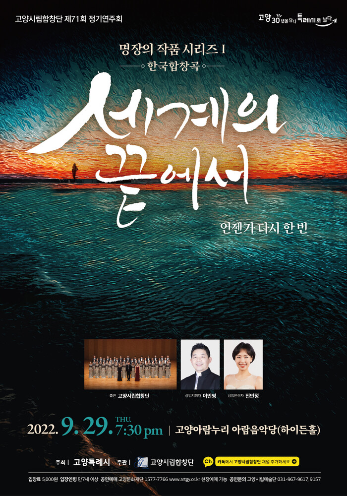 [로컬세계 = 이영원 기자]깊어가는 가을의 정취가 물씬 느껴지는 9월의 마지막 주, 지친 마음을 달래고 영혼을 살찌우는 시간을 선사하기 위해 고양시립합창단이 제71회 정기연주회 '세계의 끝에서 – 언젠가 다시 한번'을 오는 29일 오후 7시 30분 고양아람누리 아람음악당(하이든홀)에서 개최한다.