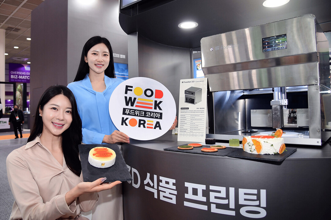 서울 삼성동 코엑스에서 ‘2025 푸드위크 코리아(제20회 서울국제식품산업전)’가 열린 가운데 모델들이 3D 식품 프린팅 기술을 보고 있다.