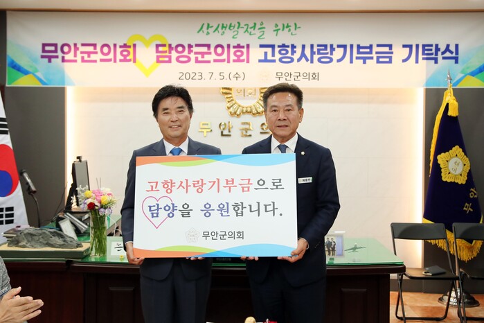 이날 기탁식은 무안군의회와 담양군의회의 의장과 의원을 비롯한 직원 30여 명이 참석한 가운데 진행됐으며, 양 기관의 의원과 직원 27명씩 54명이 동참해 양 지자체에 270만원씩 기부하며 고향 사랑의 마음을 전했다.