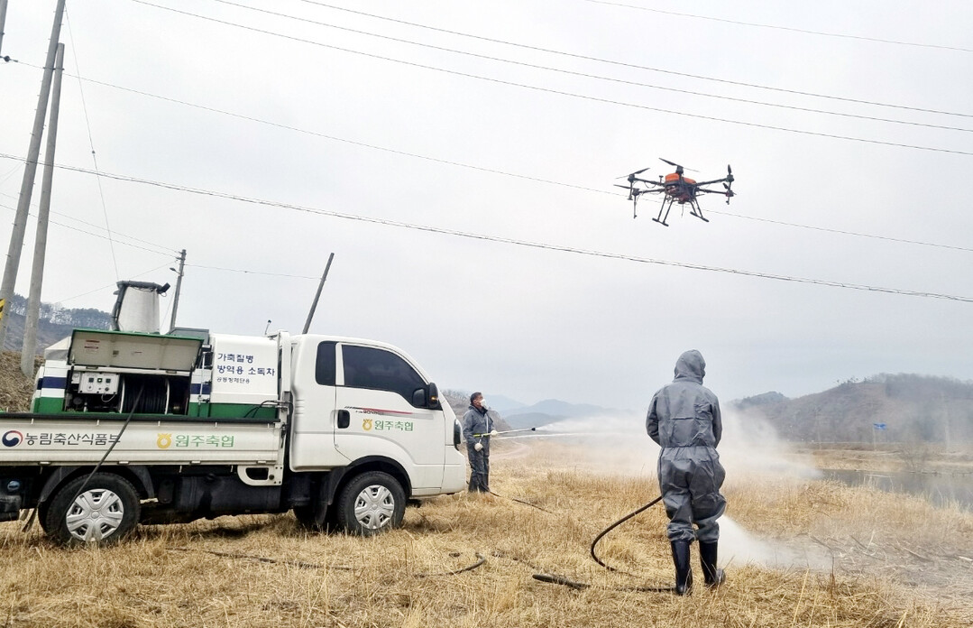 농협 강원본부 및 원주축협 공동방제단이 10일 원주천 철새도래지에서 드론과 방역차량을 활용해 축산농가 주변을 정밀 소독하고 있다.