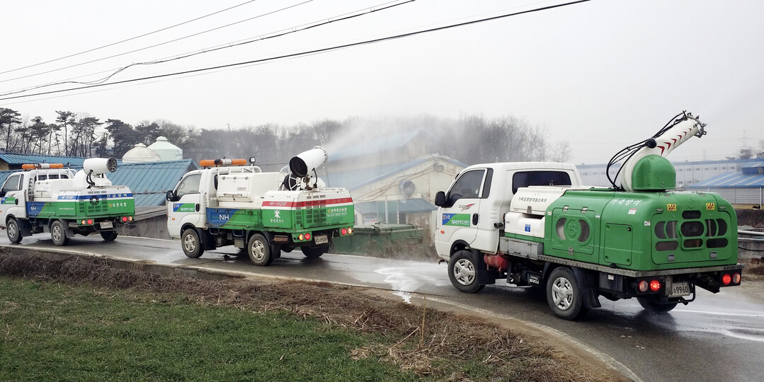 농협 경기본부 및 평택·이천축협 공동방제단이 10일 광역방제기를 동원해 경기 축산농가 소독을 하고 있다. 농협 제공
