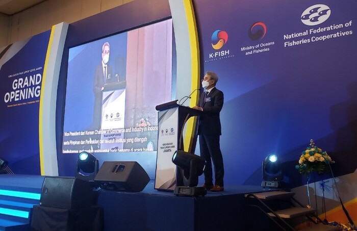 ▲ 홍진근 수협중앙회 대표이사는 2일 인도네시아 자카르타 무역지원센터 개소식에서 한국 수산식품의 할랄시장 진출 지원을 강조하고 있다. 수협중앙회 제공 |