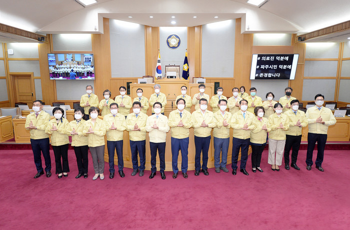 [로컬세계 최아침 기자]경기 파주시의회(의장 손배찬)는 13일 코로나19 극복을 위해 노력하는 의료진과 시민들에게 감사와 응원의 마음을 전하는 ‘덕분에 챌린지’ 캠페인에 동참했다.