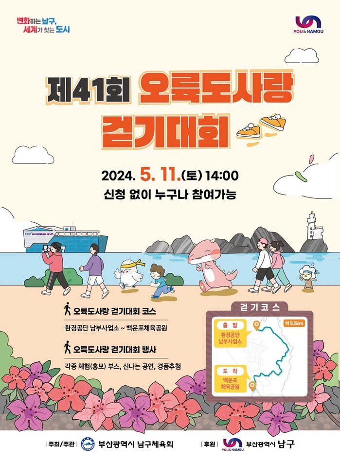 [로컬세계 부산=맹화찬 기자]부산시남구체육회가 주최·주관하고, 부산 남구가 후원하는 ‘제41회 오륙도사랑 걷기대회’가 오는 11일 오후 2시 부산환경공단 남부사업소 광장에서 개최된다.