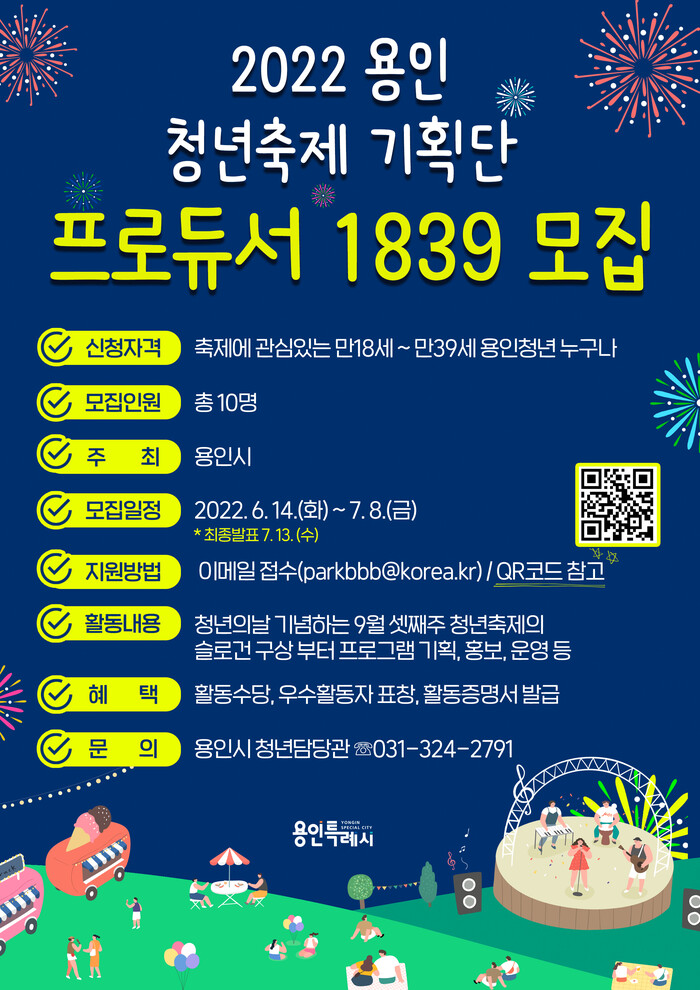 [로컬세계=김병민 기자]경기 용인시는 오는 14일부터 다음 달 8일까지 올해 청년주간행사를 기획하고 운영할 청년축제기획단 ‘프로듀서1839’로 활동할 청년 10명을 모집한다.