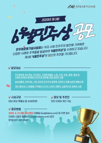 민주화운동기념사업회(이사장 지선)는 제3회 '6월민주상' 후보자를 4월 21일까지 공모한다고 밝혔다.