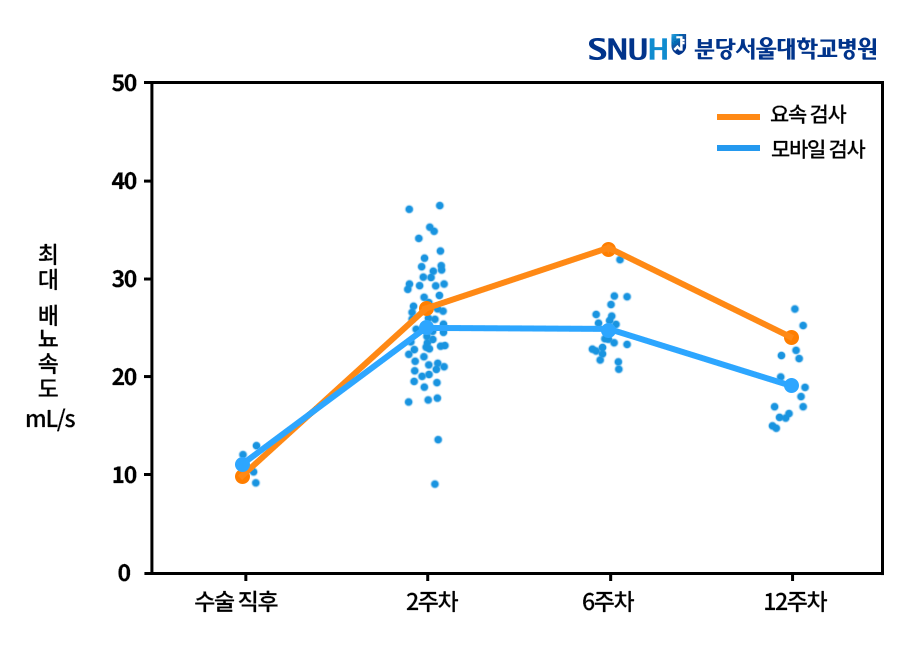 실제로 수술 전 평균 13.0mL/s였던 최대 배뇨 속도가 12주 후 20.9mL/s로 개선되는 과정을 앱이 정확히 포착했다. 또한 환자들이 느끼는 증상 개선 정도와 앱으로 측정한 배뇨 속도 향상 역시 높은 일치도를 보였다. 앱 사용 만족도는 10점 만점에 평균 9.4점으로 매우 높았으며, 70세 이상 고령 환자들도 어려움 없이 앱을 사용할 수 있었다.