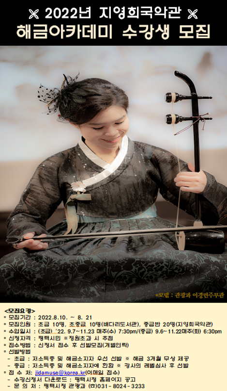 '지영희 해금아카데미'는 오는 9월부터 11월까지 초·중급반 4개 강좌를 총 48회에 걸쳐 운영한다. 교육 장소는 평택호 지영희국악관과 배다리도서관 두 곳으로, 작년에 이어 올 하반기에도 배다리도서관에 초급 1개 반을 신설해 운영할 예정이다. 평택시민이라면 누구나 응모할 수 있으며 특히 초급반은 저소득층을 우선 선발하여 소외계층에게 우리문화 향유의 기회를 제공할 예정이다.
