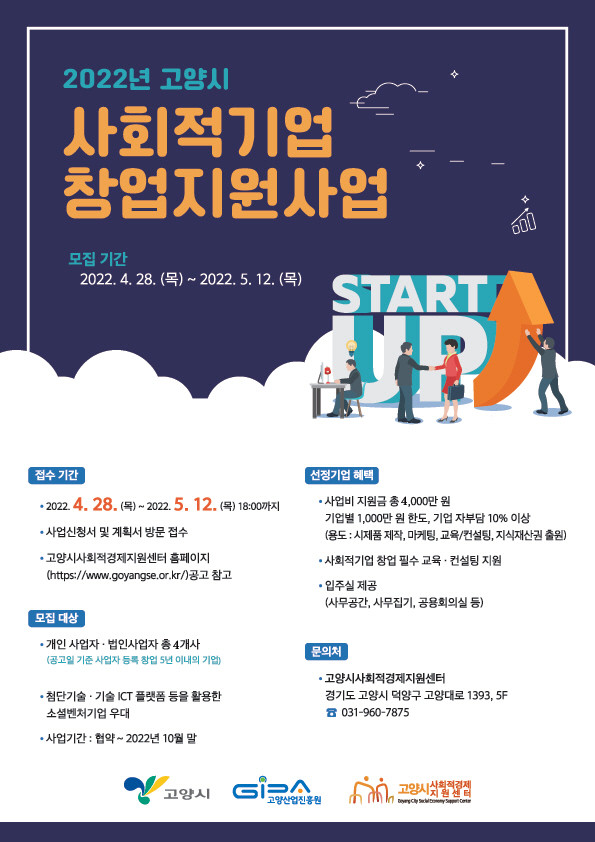 [로컬세계 이영원 기자]‘고양산업진흥원(원장 오창희) 고양시사회적경제지원센터(이하 지원센터)는 ’고양시 사회적기업 창업지원사업’ 참여기업을 오는 12일까지 모집한다.