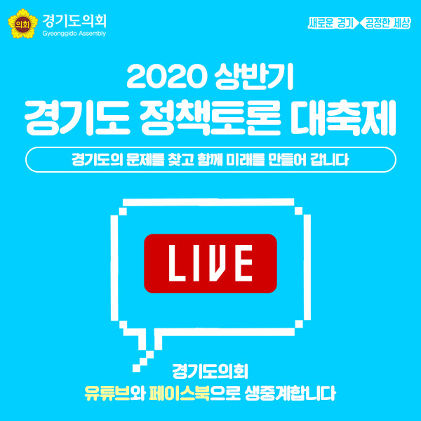 [로컬세계 고기훈 기자]경기도의회(의장 송한준)가 ‘2020 상반기 경기도 정책 토론 대축제’를 온라인 생중계 한다. 코로나 19 확산에 따른 ‘사회적 거리두기’에 동참하기 위해서다.