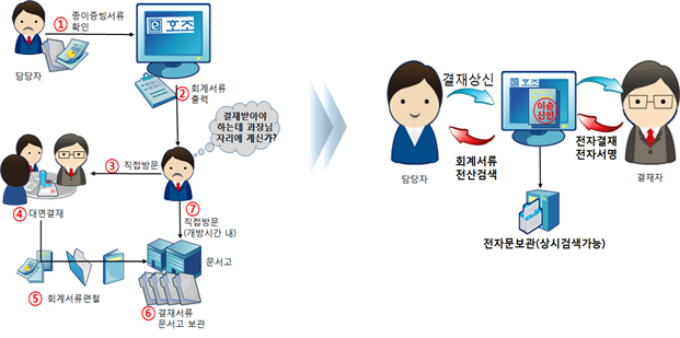 그간 회계서류에 인장을 날인 하거나 대면결재를 받아야 했다면 앞으로는 전자서고에 자동으로 문서가 첨부돼 자료 검색도 쉬워진다. 공무원들의 업무처리 시간과 비용도 단축되는 효과도 기대된다.