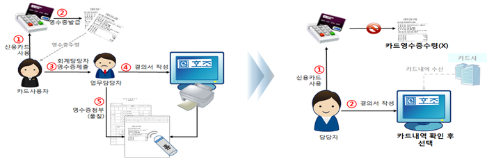지금까지는 경비지출관리 업무를 위해 법인카드를 사용할 때마다 종이 영수증을 받아 풀을 붙여 제출하고 제출된 서류를 보관해야 했다. 그러나 내달 1일부터는 신용카드의 사용정보가 카드사와 연계되면서 e호조시스템을 통해 전자영수증이 지출서류에 자동으로 첨부 돼 보다 쉬운 관리가 가능해졌다.