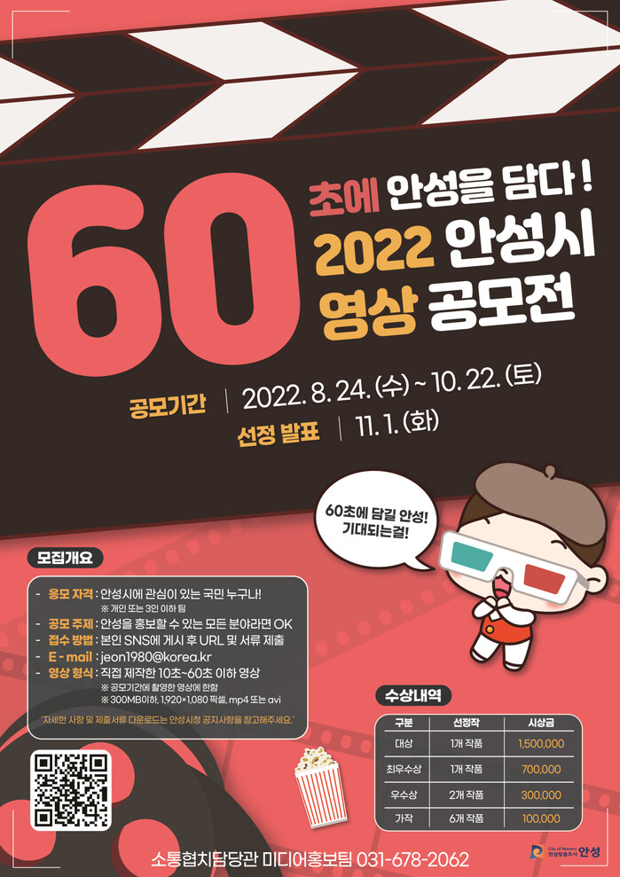 [로컬세계=김병민 기자]경기 안성시는 풍부한 역사⁃문화⁃관광자원을 보유한 안성의 매력을 참신한 아이디어로 개성있게 표현한 영상을 발굴하고자 ‘2022 안성시 60초 영상 공모전’을 개최한다고 26일 밝혔다.