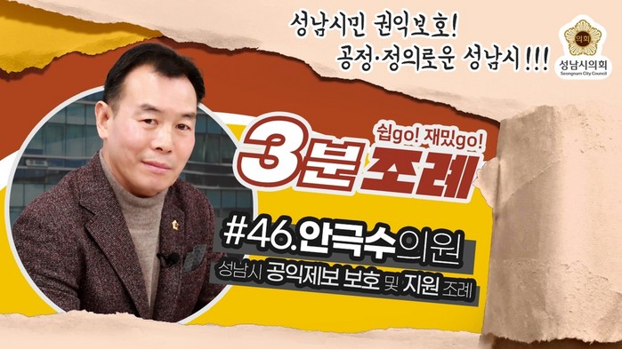 ‘성남시의회 3분 조례’는 유튜브 채널을 통하여 성남시의회 의원들이 발의하여 시행되는 조례를 시민들이 알기 쉽도록 설명하는 콘텐츠이다.
