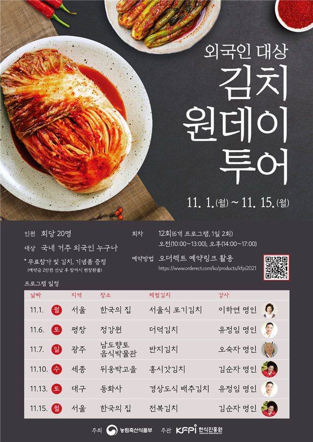 외국인 대상 김치 원데이 투어는 서울을 시작으로 6일 평창, 7일 광주, 10일 세종, 13일 대구, 15일 서울에서 하루 2회씩(10:00~13:00, 14:00~17:00) 2주간 개최될 예정이다.