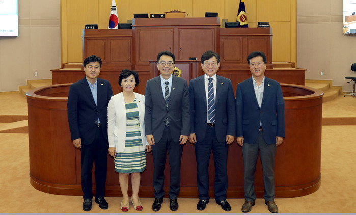 ▲대전시의회 김경훈 의장과 조원휘 부의장, 김종천 운영위원장, 박혜련 행정자치위원장이 시의회를 방문한 하승창 사회혁신수석(왼쪽에서 세번째)과 기념촬영을 하고 있다. |