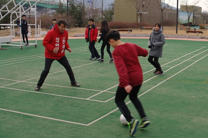 ▲진재광 예비후보가 지역 내 체육시설에서 청소년과 함께 운동을 하고 있다. |