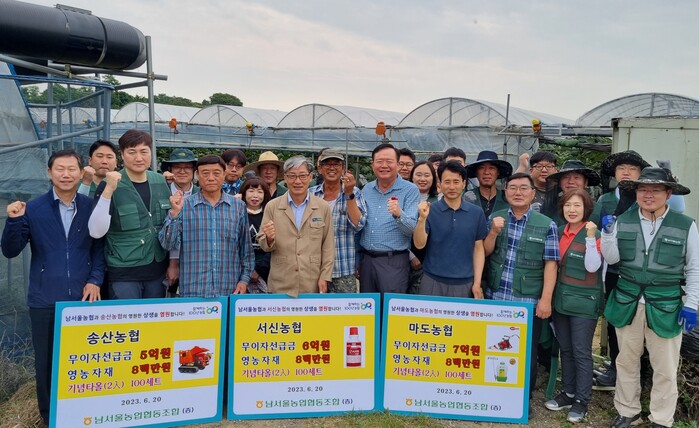 이날 도농상생 전달식에서 남서울농협은 마도농협(조합장 권태우)에는 무이자선급금 7억원과 800만원 상당의 예초기와 분무기를, 서신농협(조합장 안성철)에는 무이자선급금 6억원과