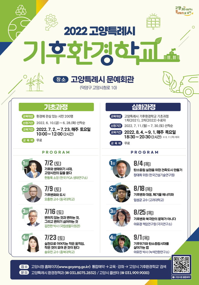 기후환경학교는 기초 과정과 심화 과정으로 운영되며 고양시 문예회관(덕양구 고양시청로 10)에서 대면교육으로 진행된다.
