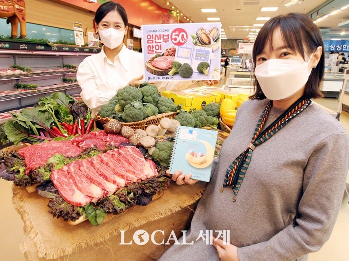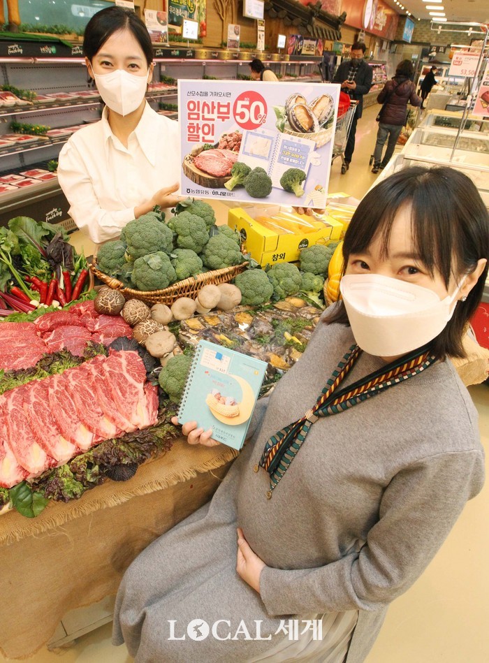 ▲17일 서울 서초구 농협하나로마트 양재점에서 모델들이 저출산 문제와 치솟는 밥상물가 부담을 덜어드리기 위해 17일 ~ 23일 7일간 계산대에서 산모수첩을 보여주면 한우 1등급 안심, 등심, 채끝, 브로콜리(1개), 활전복(대/4미), 친환경 참외(2kg)를 시중가 대비 최대 50% 할인된 가격으로 구매할 수 있는 행사를 소개하고 있다. |