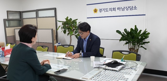 ▲추민교 의원이 하남상담소에서 대한스마트클라이밍협회 부회장과 면담을 갖고 있다.(경기도의회 제공) |
