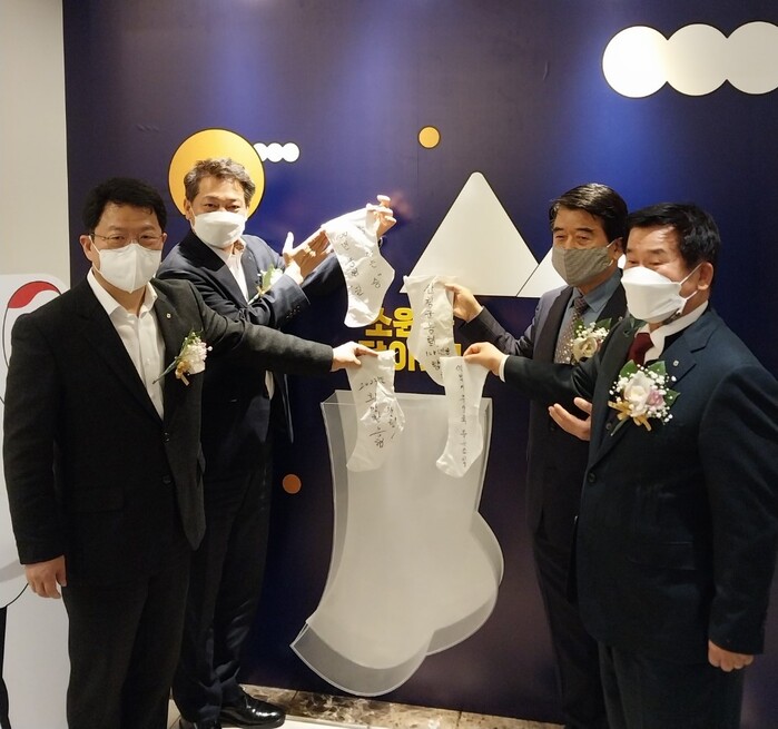 ▲ 조소행 농협중앙회 상호금융대표이사(왼쪽 두번째)와 참석내빈들이 21일 서울 중구 농업박물관에서 열린 특별기획전 "오늘이 동지래!" 개막행사에서 동지헌말(동지에 버선을 만들어 드린다) 체험을 하고 있다. |