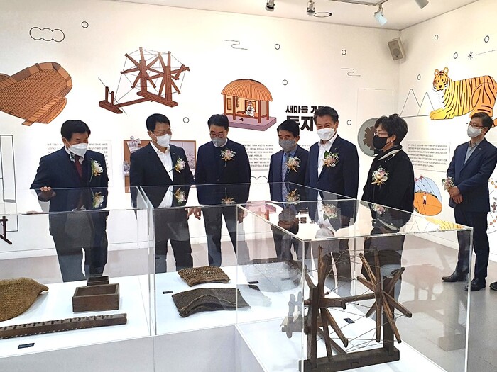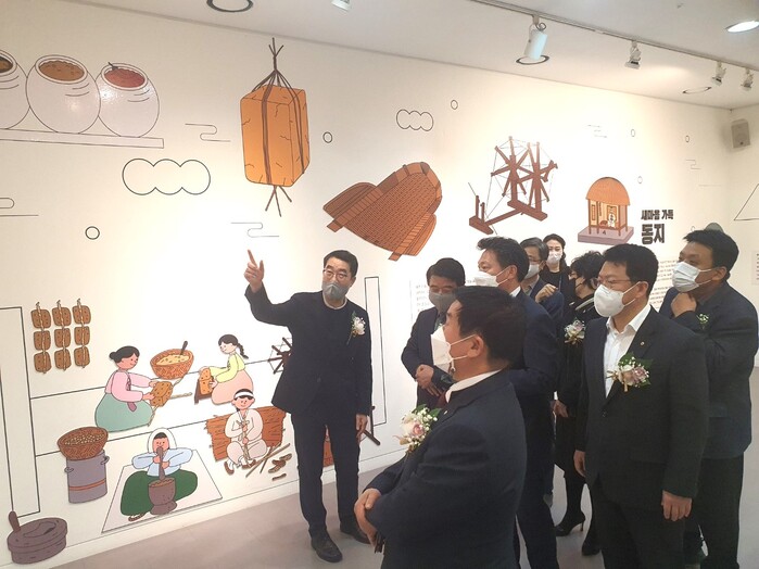 ▲ 조소행 농협중앙회 상호금융대표이사(왼쪽 다섯번째)와 참석내빈들이 21일 서울 중구 농업박물관에서 열린 특별기획전 "오늘이 동지래!" 개막행사에서 문석근 농업박물관장(왼쪽 세번째)으로부터 우리민족의 세시풍속과 농경문화에 대해 설명을 듣고 있다. |