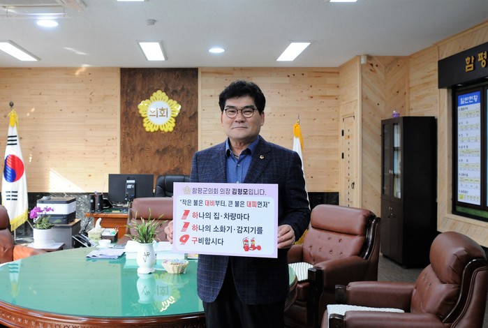 김형모 의장은 김재승 함평소방서장의 지명을 받아, ‘1(하나의 집‧차량마다), 1(하나의 소화기‧감지기를), 9(구비합시다)’가 적힌 팻말을 들고 캠페인에 참여했다.
