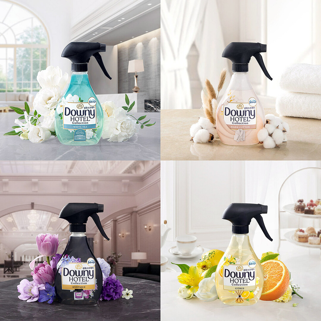 이번 ‘다우니 호텔 컬렉션 섬유스프레이’는 고급 호텔의 상징적인 공간에서 영감을 받은 ‘화이트 티’, ‘웜 코튼’, ‘미스티크’, ‘시트러스’ 등 총 4가지 향으로 구성됐다. 한국P&G 제공