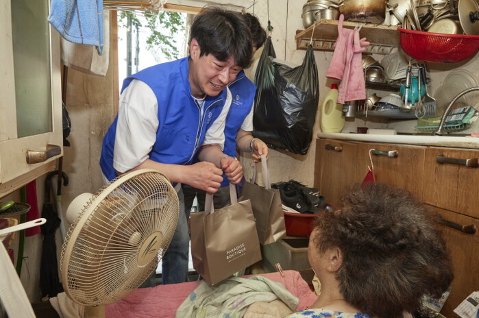 28일 오전 파라다이스 호텔 부산 임직원들이 부산 해운대구 우동 해리단길 인근에 거주하는 소외이웃에게 안부 인사와 함께 도시락을 건네고 있다. 파라다이스 호텔 부산은 해운대구 우1동 행정복지센터와 협력해 ‘사랑의 도시락’ 캠페인을 전개한다. 호텔 인근에 거주하는 독거 노인 및 저소득층을 위해 매주 금요일마다 약 50가구의 도시락 비용을 전액 지원한다. 매월 마지막주 금요일에는 파라다이스 호텔 부산 임직원들이 직접 배달 봉사 활동을 펼친다. 이번 캠페인을 통해 오는 9월까지 약 500개의 도시락이 전달될 예정이다. (사진=파라다이스 제공)