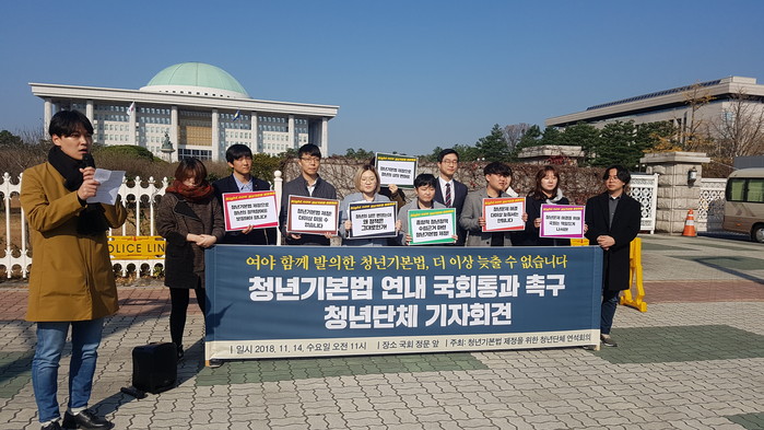 ▲청년기본법 제정을 위한 청년단체 연석회의 회원들이 14일 서울 여의도 국회 앞에서 기자회견을 갖고 청년기본법 연내 국회 통과를 촉구하고 있다.(청년유니온 제공) |