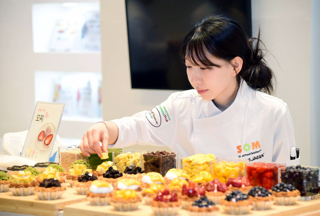 16일 서울 강남구 코엑스 D홀에서 열린 '2026 한국국제베이커리페어'에서 제빵사가 디스플레이용 디저트를 장식하고 있다.