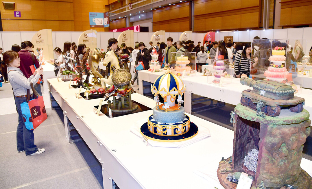 16일 서울 강남구 코엑스 D홀에서 열린 '2026 한국국제베이커리페어'에서 참관객들이 케이크 작품을 둘러보고 있다.