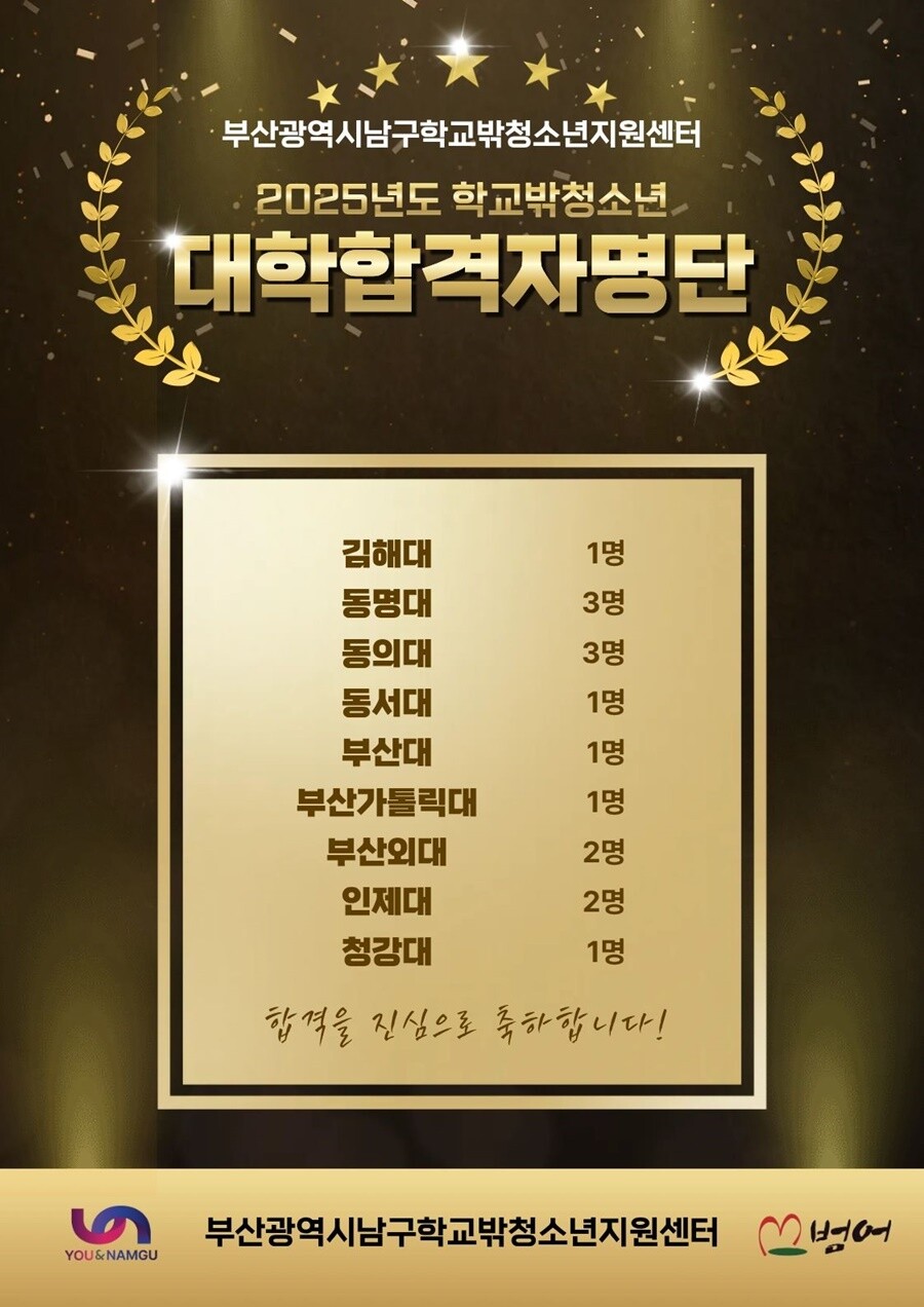 [로컬세계 = 맹화찬 기자] 부산 남구 학교밖청소년지원센터(이하 ‘남구꿈드림센터’라 한다)는 센터 소속 학교 밖 청소년 15명이 부산대학교, 인제대학교, 동의대학교, 청강대학교 등의 다양한 대학에 합격하는 성과를 거뒀다고 밝혔다.