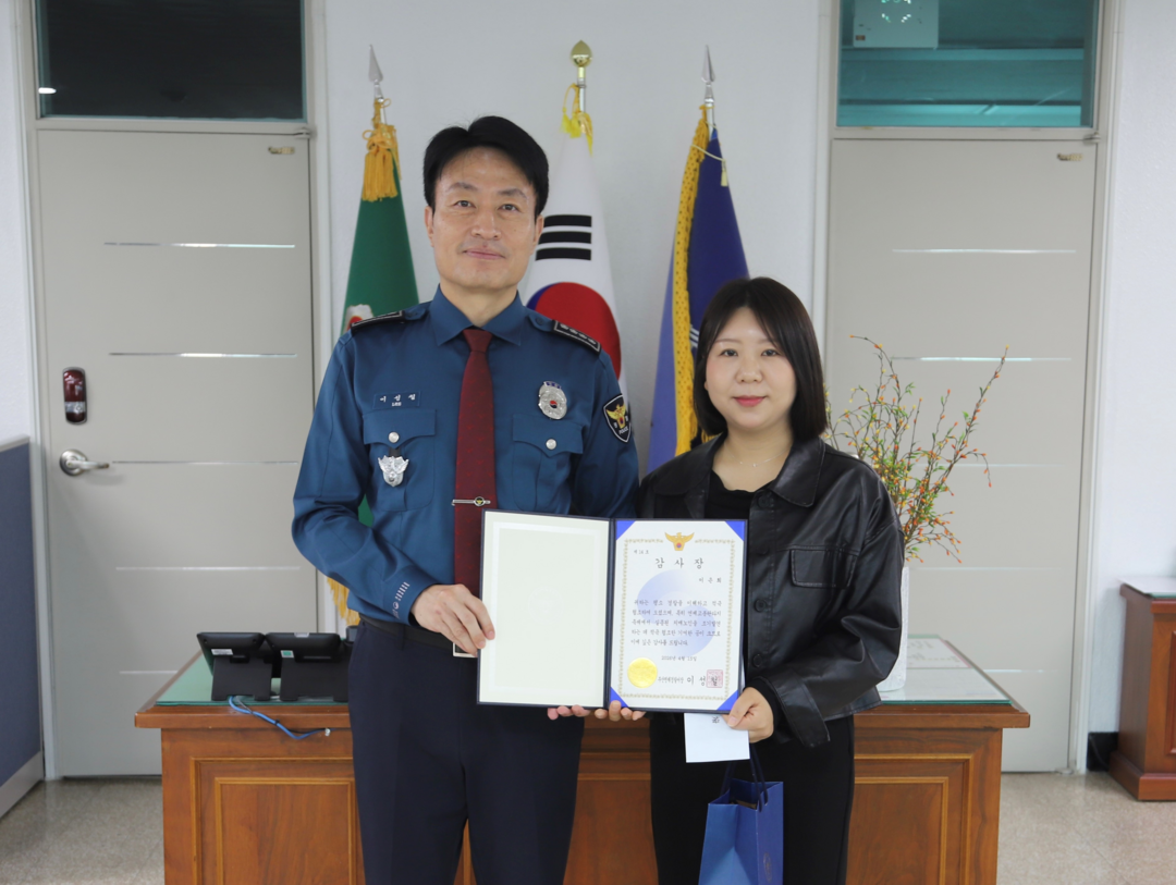 [로컬세계 = 맹화찬 기자] 부산연제경찰서는 15일 오전 서장실에서 실종 치매노인 조기발견에 기여한 유공시민 이은희씨에 대한 감사장 수여식을 개최했다.