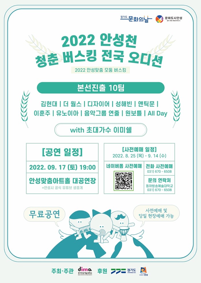 사전예매는 첨부한 QR코드(포스터 내 QR코드)를 통해 진행되며 전화예매도 가능하다. 잔여석이 있는 경우 당일 현장예매도 진행된다. 기타 자세한 정보는 안성시 홈페이지와 SNS에서 확인하거나 안성시 문화체육관광과 및 동아방송예술대학교로 문의하면 된다.
