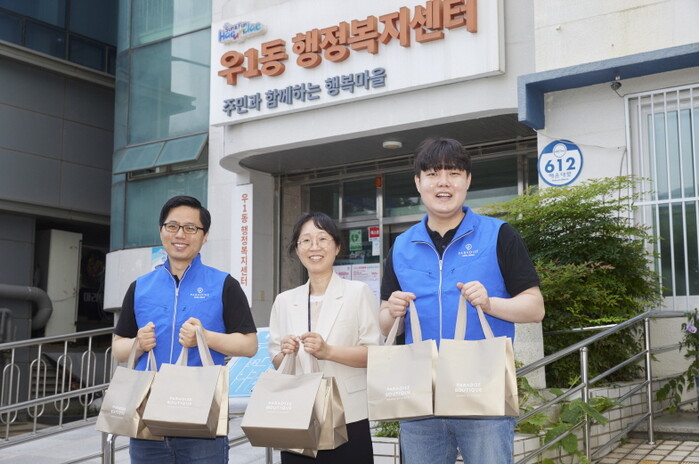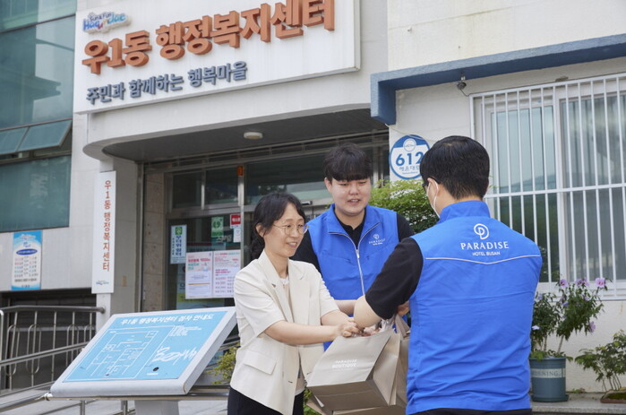 28일 오전 파라다이스 호텔 부산 직원들과 해운대구 우1동 행정복지센터 직원이 부산 지역 내 소외이웃들에게 전달할 도시락을 옮기고 있다. 파라다이스 호텔 부산은 해운대구 우1동 행정복지센터와 협력해 ‘사랑의 도시락’ 캠페인을 전개한다. 호텔 인근에 거주하는 독거 노인 및 저소득층을 위해 매주 금요일마다 약 50가구의 도시락 비용을 전액 지원한다. 매월 마지막주 금요일에는 파라다이스 호텔 부산 임직원들이 직접 배달 봉사 활동을 펼친다. 이번 캠페인을 통해 오는 9월까지 약 500개의 도시락이 전달될 예정이다. (사진=파라다이스 제공)