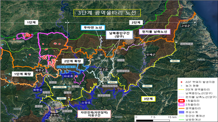 특히 화천·양구와 가까운 남양주·가평·춘천·홍천·양양 등 5개 시·군에 대해서도 농식품부와 지자체 합동점검반이 울타리 설치 여부 등을 점검하며, 지자체도 매주 1회 점검에 나선다.