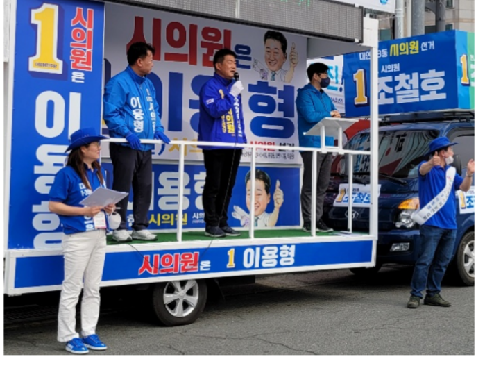 ▲22일 더불어민주당 부산 남구 이용형 시의원후보의 유세차(왼쪽)와 같은 당 조철호 시의원후보의 유세차가 동시에 출동, 유세를 하고 있다. 조철호 민주당 시의원후보 사무소 제공 |