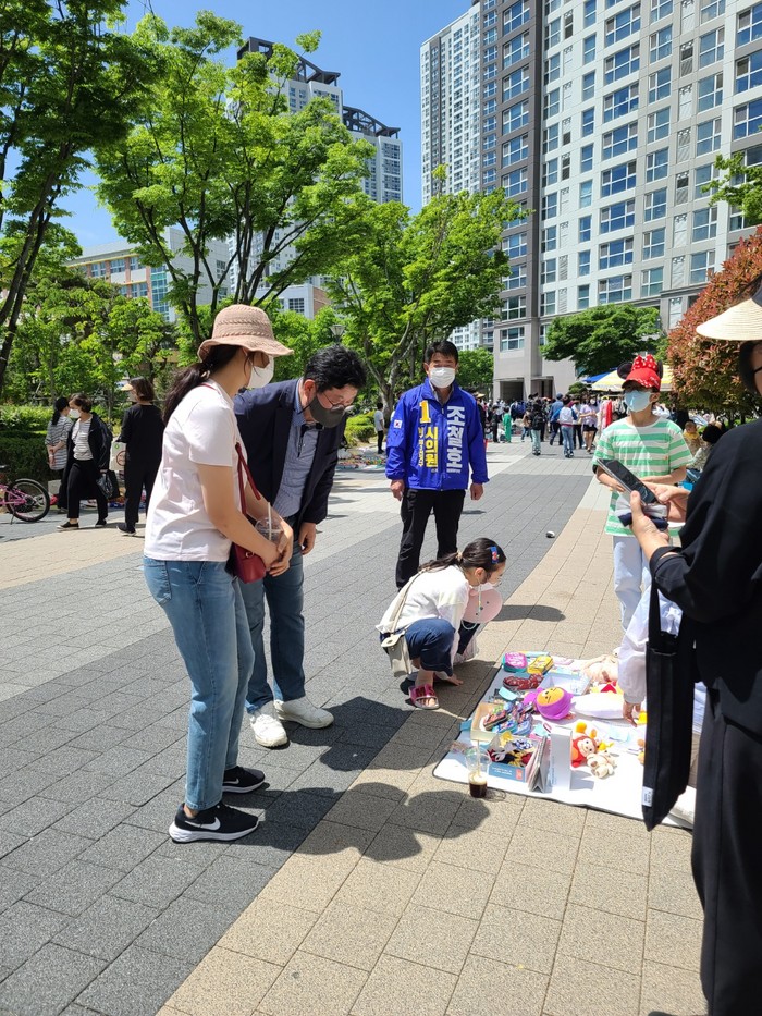 ▲부산 남구 대연3동 대연힐스테이트 푸르지오 앞마당에서 22일 아파트단지 부녀회 주관으로 열린 '아나바다 행사장'을 찾은 박재호(더불어민주당, 왼쪽에서 두 번째) 국회의원과, 조철호(민주당, 가운데) 남구 제1선거구(대연동) 시의원 후보가 주민들이 물건을 고르는 장면을 지켜보고 있다. |