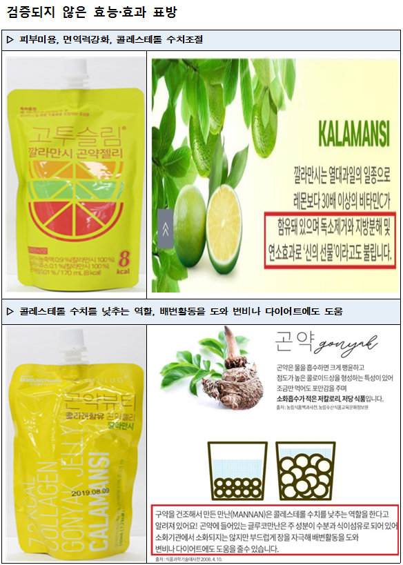 단 곤약젤리 제품에 들어있는 곤약 함량은 효능을 검증할 수 있는 양이 되지 못하며 이러한 식품에 다이어트, 지방 분해, 변비 해소 등의 표현을 하는 것은 소비자를 오인‧혼동할 우려가 있다.