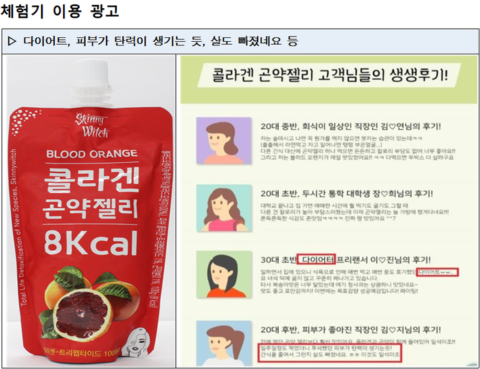 그 예로 ‘그린애플 콜라겐 곤약젤리’ 제품은 콜레스테롤 수치를 조절해준다고 광고했다. 그러나 이는 검증되지 않은 소비자 체험기를 활용한 과대광고였다.