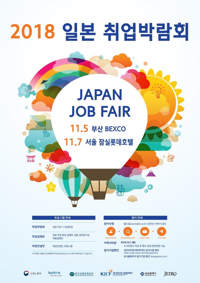 고용노동부는 5일 부산벡스코에서 우리 청년들의 일본 진출을 돕고자 대한무역투자진흥공사(KOTRA) 및 한국산업인력공단과 협력해 ‘2018 일본취업박람회’를 열었다고 밝혔다.