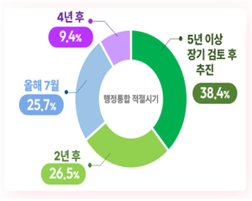 통합 시기에 대해서는 ‘5년 이상 장기 검토 후 추진’이 38.4%로 가장 많았고, ‘2년 후 출범’ 26.5%, ‘올해 7월 출범’ 25.7% 순으로 조사됐다. ‘2~5년 후’로 보는 응답이 74.3%로 집계돼, 속도보다는 준비 기간을 두고 제도 보완과 공론화를 거쳐야 한다는 의견이 우세한 것으로 분석됐다.