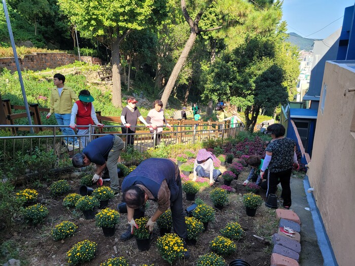 | ▲ 부산 동구 좌천동에서 동네 주민들과 함께 좌천체육공원 일원에 국화 400본을 구입하여 국화밭을 조성했다. 동구 제공 |