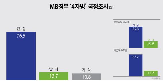 이명박 정부 ‘4자방’ 국정조사에 대해서는 ‘찬성(76.5%) vs 반대(12.7%)’로, 찬성이 압도적으로 높았다.